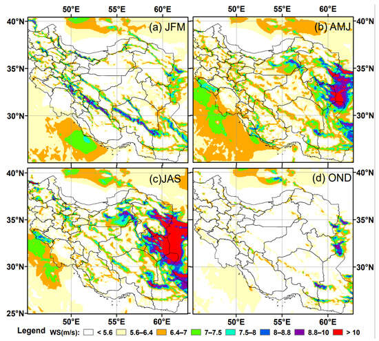 The spatial distribution of the annual mean wind speed at 10 m shows that the highest wind intensities occur in the eastern part of Iran, through the Sistan Basin and in regions north of it, where the strong and persistent Levar wind blows during the warm season. This finding is consistent with the results obtained by several previous works [104,105,106,107]. All other parts of Iran present much lower wind speeds, which are generally increased along the Zagros and Alborz mountain ranges, since stronger winds occur at higher altitudes. The Iranian Plateau and coastal areas are characterized by rather weak winds, as well as the southwest part of Iran (Khuzestan Province), which is highly affected by Shamal dust storms mostly during the warm period of the year [108,109,110]. On an annual mean basis, the effect of “Qibla wind” [103] over the central Iranian Plateau seems to have a rather limited impact on the wind regime over the region.