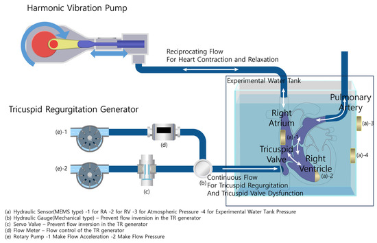 To simulate the condition of TR, the TRG and controller are activated. A hole in the middle of the right ventricle acts as the TR introduction point. A hose is attached here, and the connection area is stitched to prevent leakage. The first rotary pump, controlled by feedback from the flow meter, generates a continuous flow into the right ventricle. The second rotary pump, operating based on feedback from the rapid-response mechanical pressure sensor, ensures that the flow does not reverse, simulating the condition of TR.