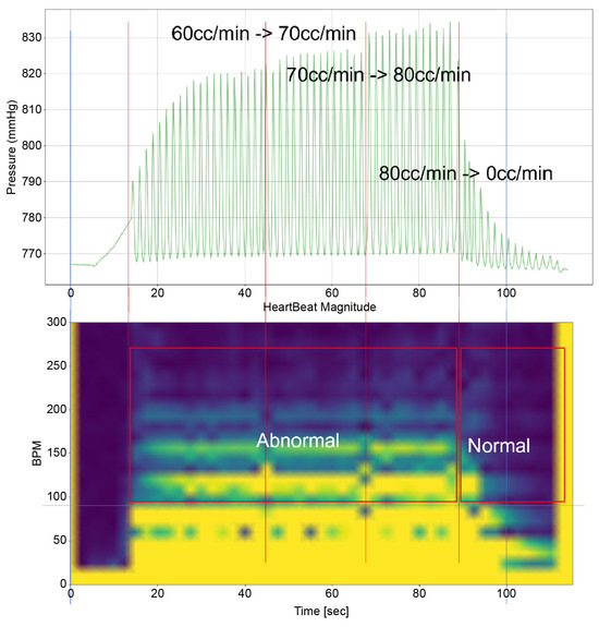 To analyze the results of this study, it is imperative to examine both the time-domain–pressure data graph for the atrium and the bpm-spectrum–time-domain data obtained through STFT(by python 3.9.9 scipy signal module 1.8.0) simultaneously. These data are exemplified in Figure 5. The pressure–time graph in this figure provides insights into the fluctuations in atrial pressure in response to changes in the intensity of the TRG. It allows us to observe the specific moments when the generator’s intensity changes and the resultant impact on atrial pressure.