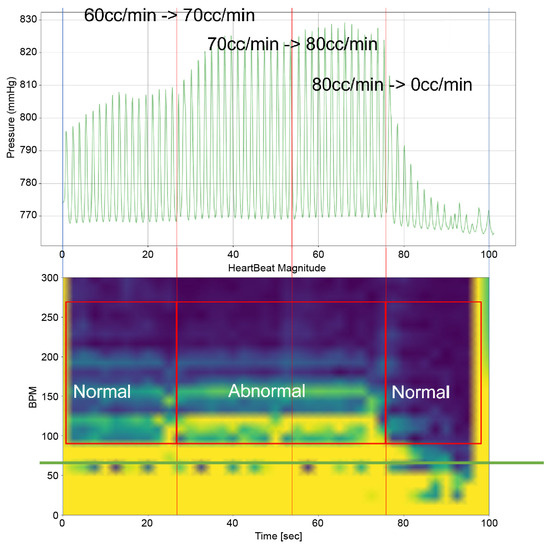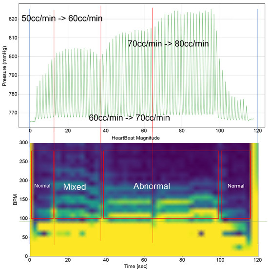 Furthermore, the bpm-spectrum–time graph depicted in Figure 5 enables the assessment of the distribution of atrial pressure amplitudes across different bpm at each moment. This analysis is crucial in identifying the bpm spectral regions that influence TR. Additionally, each spectral area in the graph is annotated to indicate the operational state of the TV—whether it is “Normal”, “Abnormal”, or in a “Mixed” state displaying both functionalities. This comprehensive approach, as illustrated in Figure 5, offers a nuanced understanding of the dynamic interplay between heart rate, atrial pressure, and TV functionality, which is pivotal in understanding the mechanisms of TR.
