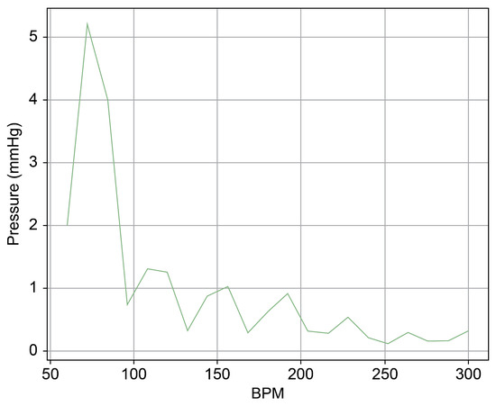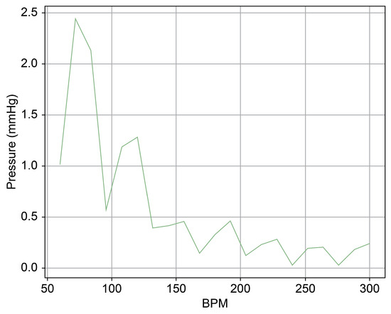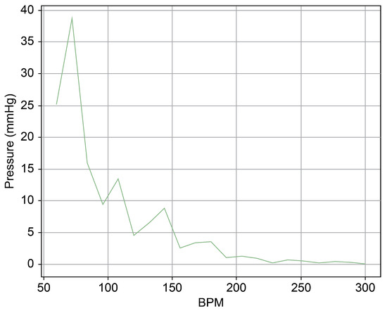 Figure 13 provides a cross-sectional view of the spectrum graph from Figure 12 during the normal phase. Similarly, Figure 14 represents the abnormal phase from the same spectrum graph. A comparative analysis between the two highlighted a significant deviation in amplitude values between 50 and 100 bpm. The peak amplitude values displayed a more than sevenfold disparity, measuring approximately 5.1 mmHg during the standard phase and 38 mmHg during the abnormal phase.