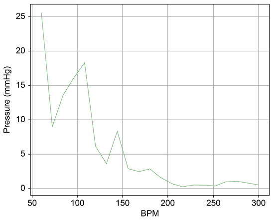 In Figure 9 and Figure 10, the region below 50 bpm was deliberately omitted. This particular region predominantly represents the pressure created by the Harmonic Vibration Pump. As a result, discerning the influence of the TRG within this range becomes challenging. Furthermore, this region’s scale did not align congruently with the other ranges, complicating the comparative analysis. For the sake of clarity and coherence in representation, it was thus removed.