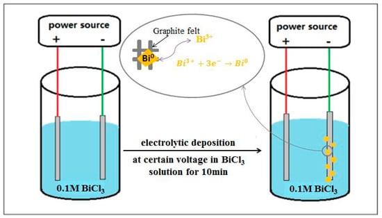 Polyacrylonitrile-based graphite felts (5 mm thickness, Gansu Haoshi Carbon Fiber Co., Ltd., Baiyin, China) were used as raw electrode materials. In order to achieve a higher carbon content, graphite felt generally needs to be treated at high temperatures to obtain a high graphitization degree. This also makes it have poor wettability, resulting in low electrochemical activity. Therefore, graphite felt must be activated properly before use. Such methods include heat treatment, surface deposition of catalysts, oxidation treatment, etc. [,]. Among them, the oxidation of graphite felt in hot air is considered to be the simplest and easiest method for industrialization. Therefore, based on previous work [], the pristine graphite felts were pretreated by traditional thermal treatment at 500 °C for 5 h, and the obtained samples were denoted as TGF (thermally-treated graphite felt). Before the electrochemical deposition, TGF was washed with distilled water and dried at 80 °C for 24 h. The deposition process was carried out by using a constant voltage source (KXN-3010D, Shenzhen Zhaoxin Electronic Instrument Equipment Co., Ltd., Shenzhen, China) as the power source. The plating solution was prepared by dissolving a certain amount of Bi2O3 (99.0%, China National Pharmaceutical Chemical Reagent Co., Ltd., Shanghai, China) in the corresponding volume of dilute hydrochloric acid (3 M) to yield a 0.1 M Bi3+ solution. As shown in Figure 1, the TGFs (3.0 cm × 3.0 cm × 0.5 cm) were immersed in the solution as both the anode and the cathode. The distance between the anode and cathode was kept at approximately 3.0 cm. Copper wires were used to connect TGFs with the power source. After the TGFs were soaked in the 50 mL plating solution for 30 min, the metal Bi was reduced in the cathode side by the power source supplying a constant voltage for 10 min. The operating voltages were selected as 0.8 V, 1.2 V and 1.6 V, and the obtained samples were denoted as Bi/TGF-0.8V, Bi/TGF-1.2V and Bi/TGF-1.6V, collectively referred to as Bi/TGFs.