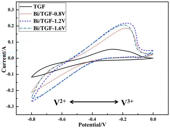 In Figure 2, the CV curves of TGF and Bi/TGFs are plotted in 1 M V3+ + 3 M H2SO4 solution. It can be seen that the curves of Bi/TGFs exhibit apparent current peaks, especially corresponding to the oxidation peak of V2+→V3+. The oxidation peak currents of Bi/TGFs are 186 mA/cm2 (Bi/TGF-0.8V), 218 mA/cm2 (Bi/TGF-1.2V) and 207 mA/cm2 (Bi/TGF-1.6V), respectively. The minimum oxidation peak is observed on the TGF (56 mA/cm2). Meanwhile, the TGF has the lowest electric double layer capacity (EDLC) of 4.085 F/cm2. However, the EDLC values of Bi/TGFs are increased to 9.262 F/cm2 (Bi/TGF-0.8V), 12.502 F/cm2 (Bi/TGF-1.2V) and 11.480 F/cm2 (Bi/TGF-1.6V), respectively. These results indicate that the Bi deposition on TGFs promotes the negative reaction of vanadium ions. In a comparison of the peak current and capacitance values, Bi/TGF-1.2V shows better electro-catalytic activity than the other samples.