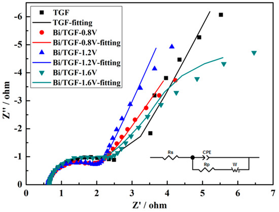 Figure 3 shows the EIS spectrograms of samples in 1 M V3+ + 3 M H2SO4 solution at a polarization potential of −0.4 V (vs. SCE). The EIS spectrograms provide further analysis concerning the influence of Bi on the electrochemical properties of TGFs on the negative side. As shown in Figure 3, each EIS spectrogram includes a semicircle and a linear part. The semicircle at high frequencies (100 Hz to 100 kHz) reflects the charge transfer resistance, while the linear part at low frequencies (0.01 Hz to 100 Hz) is related to the diffusion of vanadium ions through the solution. Thus, the EIS spectrograms indicate that negative V3+/V2+ redox couples on samples were mix-controlled by charge transfer and diffusion steps. The EIS spectrograms are fitted by an equivalent circuit in Figure 3, where Rs represents the bulk solution resistance, Rp stands for the charge transfer resistance of the electrochemical reactions, CPE is the constant phase element that accounts for double-layer capacitance, and W is Warburg impedance. The fitting results for all samples are given in Table 1. Although the pristine graphite felt had been pre-treated by the thermal method, the Rp of TGF for the V3+/V2+ redox reaction was the largest, resulting in poor electrochemical activity. However, the Rp values of Bi/TGFs were smaller, suggesting that Bi is more effective in catalyzing negative electrode reactions. In Table 1, the Rp for Bi/TGF-0.8V, Bi/TGF-1.2V, and Bi/TGF-1.6V are 1.24 Ω·cm2, 0.89 Ω·cm2, and 1.39 Ω·cm2, respectively. The results indicate that the electrodeposition potential of 1.2 V can enhance the electron transfer rate of the V3+/V2+ redox reaction.