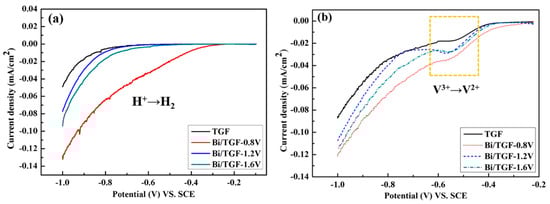 The hydrogen evolution reaction (HER) is an unavoidable side reaction. Excessive hydrogen evolution will not only cause irreversible attenuation of cell capacity but also bring serious safety risks. Therefore, HER is a serious problem that must be explored in acidic electrochemical power sources. As shown in Figure 4a, the onset potential of the HER for TGF is the highest, which is found to be −0.72 V (vs. SCE) in the H2SO4 solution. The HER onset potentials of the Bi/TGFs shifted to a more positive position probably due to some additional reactions. Although bismuth has been known to inhibit HER ineffectively [,], the onset potentials of Bi/TGF-1.6V and Bi/TGF-1.2V are indeed much closer to the TGF. The electrodeposited Bi on the graphite felt is oxidized to form BiHx by combining with H+ ions in the electrolyte. Therefore, the abrupt potential from the reduction curves of Bi/TGFs is assumed to be the reactions (5). The ability for the absorption of H+ ion is in the order of TGF < Bi/TGF-1.2V < Bi/TGF-1.6V < Bi/TGF-0.8V by decreasing current density []. The nonlinear relationship between the reaction activities of each sample to reactions (4,5) and the deposition voltage should be attributed to the morphology of Bi particles [], which was further analyzed by the SEM results. As an intermediate product, BiHx acts as an effective catalyst for the V3+/V2+ reaction, which makes the charge transfer of the reduction reaction faster in the reaction (6). As shown in Figure 4b, the reduction peak in 1 M V3+ + 3 M H2SO4 is more pronounced. It is verified that the V3+/V2+ reduction potential is around −0.55 V (vs. SCE). The values of reduction current and reduction potential corresponding to Bi/TGFs are significantly higher than those of TGF. Considering the HER, the electrocatalytic performance of Bi/TGF-1.6V and Bi/TGF-1.2V for the V3+/V2+ redox couple is better than that of Bi/TGF-0.8V.