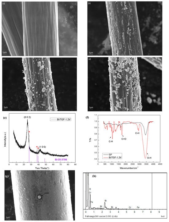 To gain a better understanding of the relationship between the surface morphology and catalytic effect, the electrodes were subjected to SEM. Figure 5a–d depict the morphology of modified fibers surfaces with and without Bi particles at the same magnification. The surface of GF appeared to be clean and smooth as shown in Figure 5a, but the surface of Bi/TGFs was attached with Bi and the size of Bi increased with the increase in electrochemical deposition voltage. The bismuth of Bi/TGF-0.8V (Figure 5b) is in the grooves on the surface of the fibers, and bismuth of Bi/TGF-1.2V and Bi/TGF-1.6V attached to the surface of the fiber is crystallized into sheets in Figure 5c,d. According to the results of LSV, the HER and hydrogen ion absorption are preferentially carried out on the tiny Bi particles, as shown in Bi/TGF-0.8V. Therefore, too many flaky Bi particles, as shown in Bi/TGF-1.2V and Bi/TGF-1.6V, are not sensitive to HER and hydrogen ion absorption. Because of this, only an appropriate Bi loading can better catalyze the negative electrode reaction. This is the reason that the results of CV and EIS for Bi/TGF-1.2V are superior to that for Bi/TGF-1.6V. The XRD result of Bi/TGF-1.2V was reported in Figure 5e, which has a perfect match with the Pure Bi standard card, indicating that the metal Bi affects the catalyst on the surface of carbon fiber. And the comparison of FTIR results between GF and Bi/TGF-1.2V in Figure 5f showed that more oxygen-containing groups appeared on the GF surface after Bi deposition (-O-H stretching vibration peak: c.a. 3600–3200 cm−1; alkyl C-H bending vibration peak: c.a. 2920–2850 cm−1; -C=O stretching vibration peak: c.a. 1720–1750 cm−1) []. It can be seen that the more active metal bismuth becomes the active center, so that the hydrophobic GF can absorb oxygen in the air and become a hydrophilic electrode material. To confirm the effect of Bi on enhanced electrochemical performances, the morphology of TGF acquired after 20 charge–discharge cycles in the cell was obtained, and the results are depicted in Figure 5g,h. The size of metal bismuth particles deposited on the surface of GF has always been a focus of researchers []. If only the catalytic activity of Bi is considered, then the nanoscale Bi will obviously be more active. However, the flow erosion of electrolytes and the electrolytic effect during the charge and discharge process will inevitably affect the existence of metal bismuth particles on the electrode surface and in the flow cells. This work attempts to control the deposition size and amount of Bi by electrodeposition voltage so that it can adapt to the internal environment of the VRFBs. Too large or too small scale of Bi is not conducive to its catalytic effect, so Bi/TGF-1.2V can be concluded to own the highest catalytic activity. EDS results showed that the Bi particles and electrolytes still remained on the surface of Bi/TGF-1.2V after 20 charge–discharge cycles (see it in the Supplementary Material).