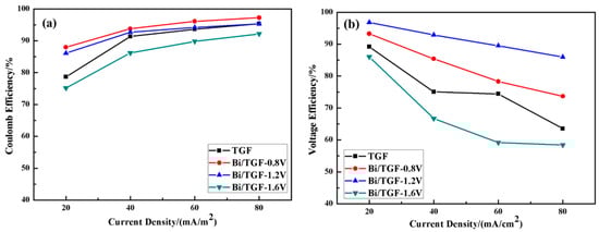 The performances of electrode samples were tested in single dynamic cells. The ‘TGF’ before or after modification with Bi was used as the negative electrodes, and the ‘TGF’ was used as the positive electrodes. Both the negative and positive electrodes possess an active area of 3.0 cm × 3.0 cm. A perfluorinated ion-exchange membrane Nafion® 115 (DuPont, Wilmington, DE, USA) was employed to separate positive and negative electrolytes. Graphite plates were employed for charge collection and transfer. The above-mentioned three components were sealed with silicon rubber gaskets. The positive electrolyte was composed of 50 mL 1.0 M V4+ + 3.0 M H2SO4, and the negative electrolyte was composed of 50 mL 1.0 M V3+ + 3.0 M H2SO4. The electrolyte was stored in external tanks and cyclically pumped into the corresponding compartments during operation. The electrolyte flows through a peristaltic pump (MP-10R, Shanghai Zhiwo Pump Valve Co., Ltd., Shanghai, China) at a flow rate of 100 mL/min. The cells were monitored by a charge–discharge test system (CT2001C-5V/2A, Wuhan Land Co., Ltd., Wuhan, China) at the current density of 20–80 mA/cm2 and the voltage window between 0.8 V and 1.65 V. The coulombic efficiency (CE), voltage efficiency (VE) and energy efficiency (EE) of single cells were estimated by the following formulas []: