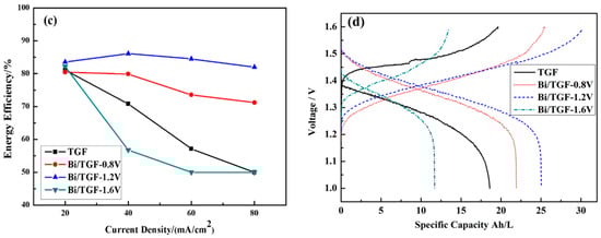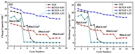 To gain further understanding of the effect of Bi catalyst on cell capacity, the changes in charge and discharge capacities of VRFBs at constant current densities from 20 mA/cm2 to 80 mA/cm2 were investigated (Figure 7). As current density rose, the charge and discharge capacities decreased. The charge capacities of the cell made of Bi/TGF-1.2V electrodes showed the highest values. At the current density of 20 mA/cm2, the charge capacities of the cell assembled with Bi/TGF-1.2V electrodes reached 23.348 Ah/L. This value was about 12.62% higher than that for TGF. At the current density of 80 mA/cm2, the charge capacities of the cell made of Bi/TGF-1.2V electrodes reached 26.294 Ah/L, while the charge capacities of the cell assembled with TGF declined to yield the lowest value. The increase in capacity was certainly attributed to the effect of Bi particles as the catalyst. However, the efficiency of Bi/TGF-1.6V dropped dramatically at 80 mA/cm2. Therefore, excess Bi particles did not benefit the electrochemical performances of VRFBs.