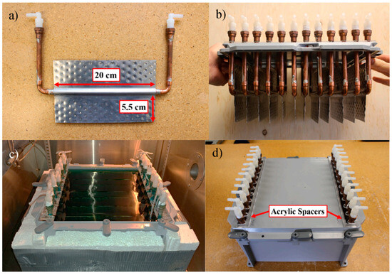 The experimental apparatus, used in Herbinger and Groulx [18], was made with multiples of the same aluminum finned-tube geometry, as seen in Figure 1a,b. Once assembled, the finned-tube heat exchanger was incorporated in a box containing 10 kg of PCM and measuring 30 cm × 30 cm × 15.25 cm (Figure 1c,d). The fin dimensions are shown in Figure 2.