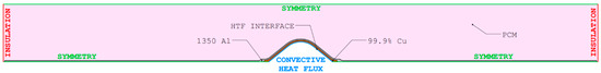Therefore, the geometry used is shown with the boundary definitions in Figure 3. In the COMSOL model, the entire rectangular domain is meant to be rotated 90 degrees clockwise so that the insulation boundaries (red) are on the top and the bottom; it is presented in this orientation in this paper for space constraints. The symmetry line of the fin and the edge of the PCM domain are defined with a symmetry condition (green), reducing the simulation domain size, and hence the simulation time and file size. The HTF surface (blue) is defined through a convective heat flux using Newton’s law of cooling. The convection coefficient is determined through empirical correlations detailed in Section 3.4, and the HTF temperature is a function of time coming from the experimental inlet temperature data that were ramped up or down at the start of experimental runs, as mentioned previously.