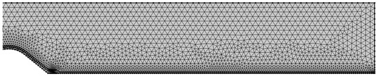 A mesh independence study was performed to determine the effect of mesh quality on numerical results. Only free-triangular elements were used to create the mesh for these numerical simulations, as shown in Figure 4. The meshing size steps were set differently for the fin and the PCM domains, with the fin being much smaller and not experiencing phase change. Five mesh sizes were used to study the effect of varying the average element sizes in both the fin and PCM domains, as shown in Table 2.
