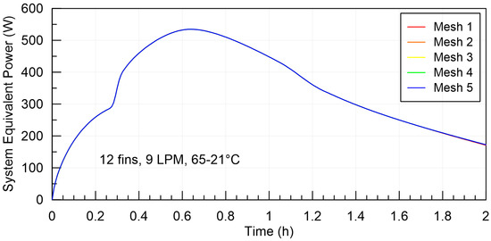 System equivalent power as a function of time for the 12 fins, 9 LPM, and 65 to 21 °C study for the five meshes used in the mesh independence study.