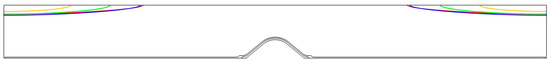 Figure 6 presents the position of the solidification interface after 7020 s for the four values of ΔT used (1, 4, 8, and 12 K). The results are shown at such a long time after the start of solidification because the impact of the mushy-zone temperature range (ΔT) becomes more noticeable then. It can be observed that the position of the interface, therefore the amount of PCM solidified, varies slightly with values of ΔT. The position of the interface is mostly the same for ΔT of 1 and 4 K, with the difference increasing with an increase in ΔT.