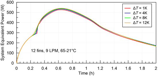 System equivalent power as a function of time for the 12 fins, 9 LPM, and 65 to 21 °C study for four mushy-zone temperature intervals: ΔT = 1, 4, 8, and 12 K.