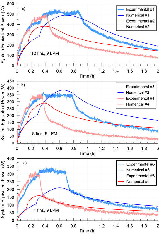System equivalent power as a function of time for six numerical validation cases compared to experimental results from [18]: (a) 12 finned tubes, (b) 8 finned tubes, and (c) 4 finned tubes. The case numbers are indicated in Table 3 for reference.