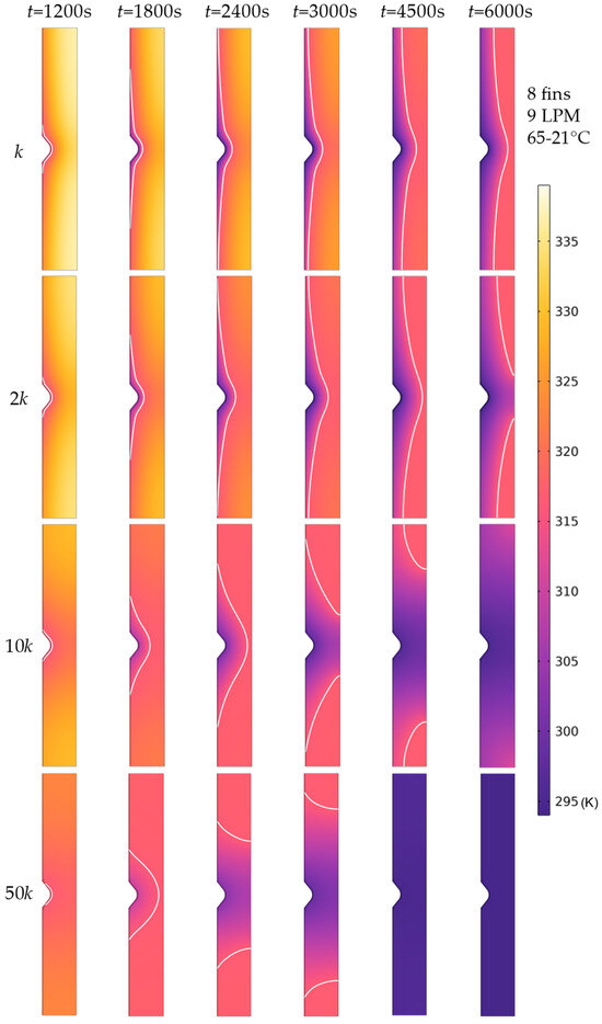 Temperature distribution snapshots at timesteps of 1200 s, 1800 s, 2400 s, 3000 s, 4500 s, and 6000 s for parametric study of 8 finned tubes at an HTF flowrate of 9 LPM, being discharged from 65 to 21 °C, showing thermal conductivities of k, 2k, 10k, and 50k.