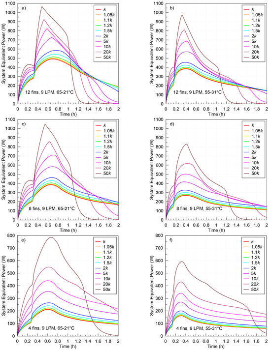 System equivalent power over time as a function of the PCM solid and liquid thermal conductivities from k to 50k for simulations with an HTF flow rate of 9 LPM: 12 finned tubes from (a) 65 to 21 °C and (b) 55 to 31 °C; 8 finned tubes from (c) 65 to 21 °C and (d) 55 to 31 °C; 4 finned tubes from (e) 65 to 21 °C and (f) 55 to 31 °C.