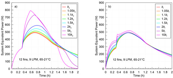 Finally, the numerical model allows studies where just the solid or liquid thermal conductivity of the PCM is changed (with the thermal conductivity of the other phase staying at the original dodecanoic acid value of k). Figure 11a shows the system equivalent power when the liquid thermal conductivity remains at k and only the solid thermal conductivity is increased.