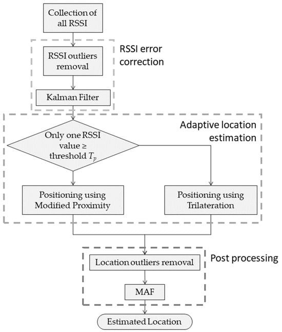 In this paper, we propose the PAP algorithm for RSSI-based indoor positioning. The proposed method is structured into three steps: RSSI error correction, adaptive location estimation, and post-processing. The RSSI error correction step removes outliers and corrects noise in collected RSSIs. The adaptive location estimation step selects either a conventional trilateration or MP technique based on distances from APs for a positioning method. The position is determined through only one AP if an RSSI received from this AP is higher than a certain threshold Tp. Location outliers are removed in the post-processing step by excluding estimated coordinates outside designated positioning regions. Then, positioning results are corrected by the moving average filter, which collects the estimated coordinates and obtains the average coordinates in a window. Figure 1 illustrates the flow for the proposed method.