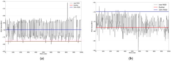 Signal effect depending on the presence or absence of obstacles at a distance of 10 m: (a) 10 m LOS raw RSSI; (b) 10 m NLOS raw RSSI.