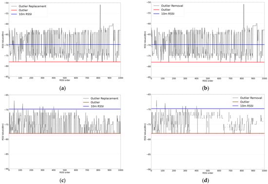 RSSI outlier handling: (a) outlier replacement in LOS; (b) outlier removal in LOS; (c) outlier replacement in NLOS; (d) outlier removal in NLOS.