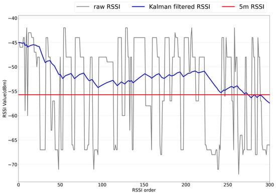 Figure 4 shows the RSSI correction through the KF. The gray, blue, and red solid lines represent the raw RSSIs, the corrected RSSIs through KF, and an RSSI at a distance of 5 m, respectively. The KF reduces distance estimation errors by smoothing the RSSIs.