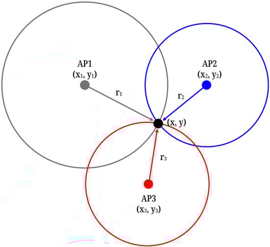 The trilateration technique involves estimating the position using the straight-line distances from three points. Indoor positioning using the trilateration technique converts the RSSI collected from three APs into distances and can thereby estimate the location of the receiver. Figure 5 shows the determination of a receiver location through three AP distances. Three circles in Figure 5 are formed with the distance as the radius based on the locations of AP1, AP2, and AP3 and the distance from each AP to the receiver. The receiver location is determined as a point where the three circles commonly intersect.