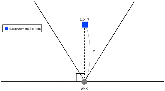 A previous approach for positioning [34] primarily identifies which AP is closest to the receiver to estimate the approximate region. However, this technique has proven difficult for indoor localization due to significant errors in the physical location of the actual receiver. Although this problem can be alleviated by increasing the number of AP installations to refine the region and identify the locations, it is not an efficient positioning technique because the cost increases in proportion to the number of APs. The proposed MP technique can solve the limitations of the previous proximity technique. Since the MP technique is selectively applied only in cases of extremely close proximity to a specific AP, it does not need additional AP installations in other regions. Unlike the existing proximity technique, the MP technique considers the distance to the identified nearby AP based on the received RSSI and the AP locations. Therefore, the MP technique is a more accurate positioning method compared to the conventional proximity technique. The MP technique internally varies its positioning technique depending on the identified locations of nearby APs. Virtual numbers are sequentially mapped to the installed APs, as shown in Figure 6. If the AP number is not first or last, the AP location is estimated by vertically moving the position a distance r from the nearby AP to the inner region, as shown in Figure 7. The method of position estimation through vertical shifting differs based on whether the identified AP number is odd or even. If the number identified as a nearby AP is odd, such as AP3 in Figure 7, the distance calculated by calculating the RSSI collected from the nearby AP is defined as r. Afterward, the coordinates obtained by adding the distance r to the y-coordinate of the identified nearby AP location coordinates are taken as the location estimation result. If the identified nearby AP number is even, the AP location is estimated by subtracting distance r from the y-coordinate of the respective AP’s location coordinates.