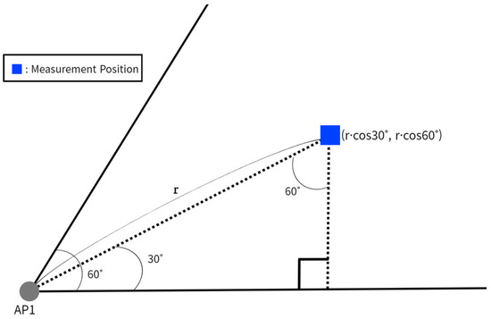 When the AP has the first or last number, the same estimation method cannot be applied. The estimated location will be outside the intended region if the AP location is determined vertically. The position is determined for the AP with the first or last number by moving a distance of r toward the incenter of an equilateral triangle formed by three neighboring APs, including the identified nearby AP. The position moved a distance r towards the incenter from an identified nearby AP can be calculated by the trigonometric ratio and the properties of triangles that the incenter of a triangle is the intersection point of its angle bisectors. As shown in Figure 8, a line toward the incenter can be formed by drawing an angle bisector of length r from AP1. Additionally, we can obtain a virtual right triangle with this bisector as the hypotenuse. With the knowledge of all angles and the hypotenuse length of this right-angled triangle, the x- and y-coordinates of the estimated position can be calculated using trigonometric ratios. For the imaginary right triangle, cos 30° for the AP1 vertex is equal to the x-coordinate to be estimated divided by the hypotenuse length r. This expression is then rearranged to formulate the x-coordinate, resulting in the computation of x as r·cos 30°. For the imaginary right-angled triangle, where the vertex representing the estimated position has an angle of 60°, the cos 60° at this vertex is equivalent to the y-coordinate divided by the hypotenuse length r. This relationship can be rearranged to derive a formula for the y-coordinate, resulting in the calculation of y as r·cos 60°. Conversely, if the identified AP is the last number, x is subtracted from r·cos 30° and y is subtracted from r·cos 60° using the coordinates of the last AP location, and the coordinates are used as the estimated location.