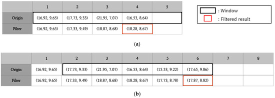 Despite correcting the unstable one-dimensional RSSI through the RSSI filtering process, there are still instabilities when calculating two-dimensional coordinates through the mathematical operations of trilateration. To enhance positioning accuracy and improve precision, filtering for the two-dimensional coordinates is necessary. The MAF is commonly adopted to improve precision when noise exists in the data for tracking moving objects [35]. MAF calculates the average of the collected data within a fixed window size. Since the MAF operates using a sliding window approach, where the window moves one step at a time, it can calculate positioning results from collected signals without any loss in quantity. Figure 10 illustrates the MAF process. In Figure 10a, during the initial step where fewer data points are collected than the window size, the positioning results are obtained by averaging the collected coordinates. Subsequently, in a sliding window structure as shown in Figure 10b, the coordinates are averaged over the window size to determine the positioning results, and this process repeats. In this paper, the window size is set to 5. Utilizing MAF allows for the correction of abrupt changes in estimated positions, thereby enhancing both the accuracy and precision of the positioning results.