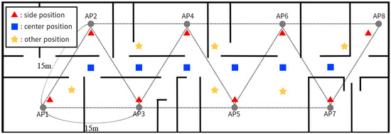 To measure the performance of the proposed method in real-world environments, experiments are conducted in an indoor environment with the layout shown in Figure 12. The thick lines in Figure 12 represent concrete walls with a thickness of approximately 0.2 m, while the gray dots indicate the positions of the beacons placed inside the building. Three adjacent beacons are installed to form an equilateral triangle with a side length of 15 m. There is a total of eight Beacons used for the experiment, covering an approximate region of 585 m2. Figure 12 represents the positioned locations for accuracy measurement. In Figure 12, triangles indicate points proximate to the AP within 1 m, squares represent the center positions of three adjacent beacons, and stars denote arbitrarily designated points.