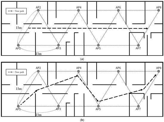 For this session, dynamic state experiments are conducted to validate the overall performance of the proposed PAP algorithm and the effectiveness of the MP technique. Figure 13 shows the positioning environment floor plan and the dashed lines representing the positioning movement paths for the dynamic state experiments. The total movement distance in Figure 13a is 45 m, while it is approximately 63 m in Figure 13b.