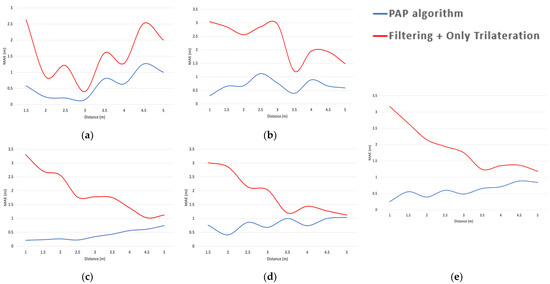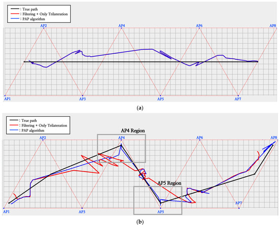The dynamic positioning test evaluates the performance of the PAP algorithm by comparing the performance of the proposed method with a positioning technique using only trilateration with the same filtering algorithm applied. For the experiment, location estimation is conducted while moving at a constant speed along a designated path. Figure 14 shows the location estimation results of the experiment along the positioning path. In Figure 14, the black solid line is the actual path, the red solid line represents the location estimation path using only trilateration, and the blue solid line represents the location estimation path through the PAP algorithm. Figure 14a shows the experimental results when walking in a straight line through the middle of APs. Positioning in the central region is not close to the AP, so the MP technique is not applied. As a result, the solid red line and solid blue line show the same positioning results. In the case of the experimental results measured along the path in Figure 14b, differences can be seen with or without the MP technique applied. For the AP4 and AP5 regions, the solid blue line shows that when the path is close to the AP, the MP technique is applied, and the positioning is similar to the actual path. However, the solid red line did not reach the region close to the AP, and the positioning continued along the next movement route. This can be seen as a phenomenon that occurs due to the problem of positioning in trilateration in weak signal regions. When approaching an AP, the RSSI of one AP is strong, but the RSSI of the other two APs is weak due to the NLOS environment. Therefore, RSSI is deleted through OR, making positioning impossible at that location. Therefore, the red solid line represents the actual path and the location estimation result with a large error, especially when close to the AP. Figure 15 presents a graph of the position estimation error of the experimental results on the actual path within 5 m of AP1, AP4, AP5, and AP8 in Figure 14b. The solid red line shows the positioning error using trilateration only, and the solid blue line shows the error of the PAP algorithm. It is shown that the error in positioning using the PAP algorithm decreases significantly as it gets closer to the AP. This indicates that the PAP algorithm, where the MP technique is applied when close to the AP, helps improve positioning accuracy.