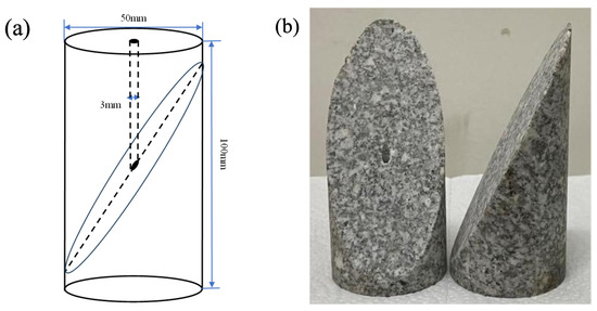 Cylindrical samples that were 50 mm in diameter were cored and then cut to a length of 100 mm. Then, the cylinders were cut at an angle of 45° or 30° with respect to their axes to form an elliptical saw-cut fault interface. The fault interface was polished with 60 mesh sandpaper. Finally, we drilled a borehole of 3 mm in diameter in the middle to simulate an injection well that runs through the upper half of the rock sample to connect the upper surface and fault interface, allowing the injected distilled water to directly reach the fault interface (Figure 1).