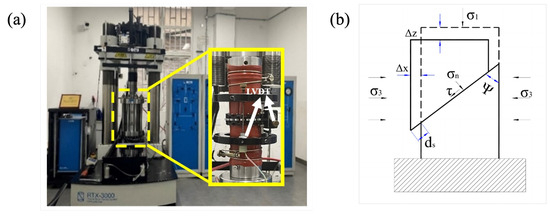 A triaxial testing apparatus was utilized in this experiment, as shown in Figure 2. The maximum axial load of the test system is 3000 kN and the maximum confining pressure is 200 MPa with a triaxial cell. The pore systems have a capacity of 200 MPa, and the temperature can reach 200 °C, which meets the experimental requirements of injection-driven shear tests under triaxial conditions in this study. The axial stress (MPa) and confining pressure (MPa) can be monitored and obtained in real time within the GCTS. The deformation of a sample under stress is shown in Figure 2b. The normal stress (MPa), effective normal stress (MPa), and shear stress (MPa) on the fault are as follows: