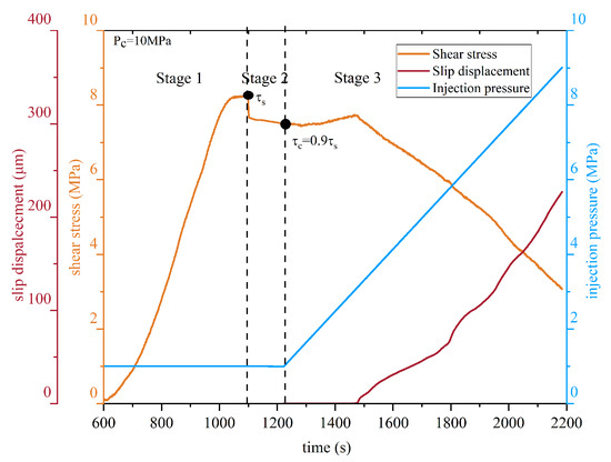 Diagram of the whole load path including the following: displacement-driven shear test (Stage 1), unloading (Stage 2), and injection-driven shear test (Stage 3), performed at pressurization rates of 0.5 MPa/min, = 10 MPa, and an inclination angle = 30°.