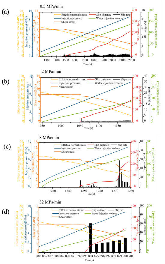 At 0.5 MPa/min, as the injection pressure increased, the fault continued to slip at a rate of no more than 1 m/s, and the effective normal stress and shear stress decreased linearly with the slip. The whole process resembled quasi-static slip (Figure 4a), as no locked phase appeared after slip initiation. In contrast, the slip process under higher pressurization rates (2 MPa/min, 8 MPa/min, and 32 MPa/min) showed a high peak slip rate (>15 m/s), indicating that a dynamic slip appeared and was accompanied by a sharp drop in shear stress and effective normal stress (Figure 4b–d). At the higher pressurization rate of 8 MPa/min, the slip process underwent two dynamic slip phases, and the peak slip rates of the two dynamic slips reached 15.57 m/s and 59.89 m/s, respectively, which were accompanied by two shear stress drops of 0.4 MPa and 0.64 MPa each (Figure 4c). Between the two dynamic slips, a fault locked phase was detected, which indicated that the fault stopped slipping. This embodied an obvious stick-slip characteristic. At 32 MPa/min, the highest slip rate of 64.6 m/s was detected among the four tested pressurization rates (Figure 4d). Cumulative slip distances under four conditions were similar, at approximately 0.2 mm, but the methods of cumulation are different. Under low pressurization rates (0.5 MPa/min and 2 MPa/min), cumulation occurred through slow slip over a long period of time. In contrast, rapid slip over a short period of time caused the cumulation of the slip distance when the pressurization rate was high.