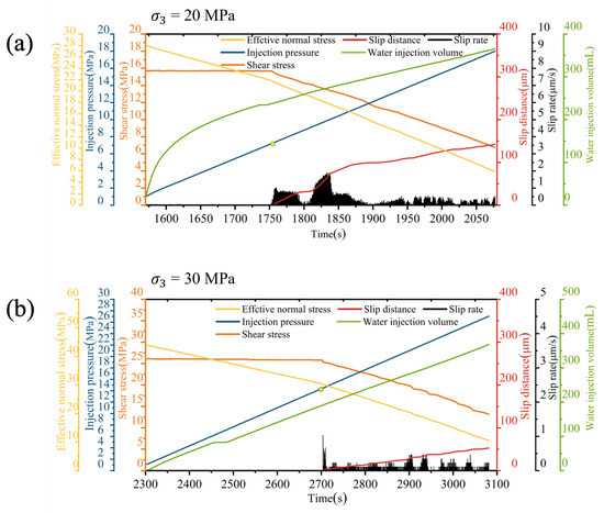 The evolution of the shear stress , effective normal stress , injection pressure p, slip distance , slip rate , and water injection volume under different confining pressures is shown in Figure 5. The yellow circle in Figure 4b shows that the injection pressure required for the initiation of slip was 1.70 MPa at a confining pressure of = 10 MPa. In Figure 5a,b, the injection pressures required for fault slip initiation were 7.30 and 14.48 MPa, which correspond to = 20 and 30 MPa, respectively, indicating that a greater injection pressure was needed to reactivate a fault when the confining pressure was higher.