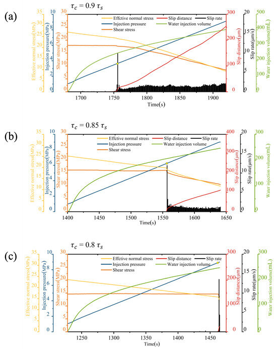 The evolution of the shear stress , effective normal stress , injection pressure p, slip distance , slip rate , and water injection volume under different initial stress states is shown in Figure 6. Shear stress was started at 90% (Figure 6a), 85% (Figure 6b), and 80% (Figure 6c) of their shear strength. As the initial stress state decreased, the injection pressure needed for reactivation initiation increased, from 3.63 MPa at 90%, to 6.26 MPa at 85%, to 8.97 MPa at 80% (yellow circles in Figure 6). The closer the initial stress state was to the shear strength, the easier it was to slip.