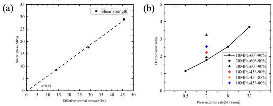 where px is the ratio of the injection pressure p (MPa) at the initiation of slip to the theoretical fluid pressure when slip occurs, and (MPa) and (MPa) are the normal stress and shear stress on the fault, respectively. The friction coefficient = 0.64 was fitted with the shear strength obtained by the displacement-driven shear test under different confining pressures (Figure 7a).