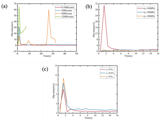 To further study the slip characteristics of faults, changes in the slip rate with time after fault slip initiation were compared and analyzed, as shown in Figure 9. Through the shear tests on cracks, Cappa [38] used quasi-static slip to represent fault slip at low speeds(less than 10 m/s) and dynamic slip to represent fault slip at high speeds (more than 10 m/s). In this article, the same terminology is used to further analyze slip mode.
