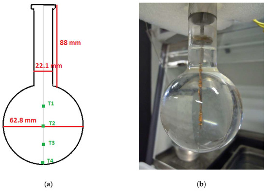 Arrangement of thermocouples T1 to T4 inside the flask: (a) thermocouples arrangement diagram (b) experimental set-up close-up photo.