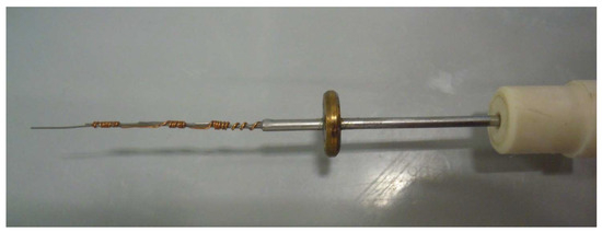 A Pyrex glass “round-bottom” flask was used as a spherical containment capsule. The flask had an external diameter of 62.8 mm and a wall thickness of 1.5 mm. Four thermocouples were arranged inside the flask, spaced 1.5 cm apart from each other, and starting from the bottom of the container, as shown in Figure 1. The thermocouples were held in position using a solid support (a metal tube) welded to a washer (arranged along the neck of the flask) which prevented the thermocouples from moving when the paraffin melted (see Figure 2). A fifth thermocouple is used to monitor and record the temperature of the water in which the balloon was immersed.