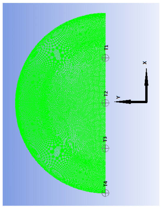 After a mesh independency check, a hybrid unstructured mesh with 35,320 elements and 34,997 nodes was used: the grid had a greater resolution for the cells near the wall where the maximum heat flow occurs. A gravitational acceleration of 9.81 m/s2 is set in the negative direction of the x-axis: therefore, the denser mass tends to precipitate in this direction. Four points were monitored in the simulation (Figure 3), which correspond to the position of the 4 thermocouples arranged inside the rounded-bottom flask (Figure 1).