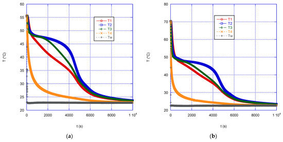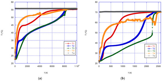 During solidification (Figure 5), the measured temperatures initially drops almost simultaneously inside the paraffin mass, until a temperature of approximately 49 °C is reached, which is the temperature at which the transition to the solid state of the material begins. Subsequently, the temperature in the correspondence of the heat exchange surface decreases more quickly, due to the formation of a solid layer close to the wall, which slows down heat exchange with the external volume, due to its low thermal conductivity. The formation of this “insulating” layer, which thus becomes the controlling step of the heat exchange process, is probably the cause of another interesting result occurring during the discharge phase: regardless of the initial temperature, the time necessary to reach thermal equilibrium is almost the same, in the present case approximately 2.8 h. It can, therefore, be deduced that the discharge speed of a TES does not depend on the initial temperature of the liquid PCM.