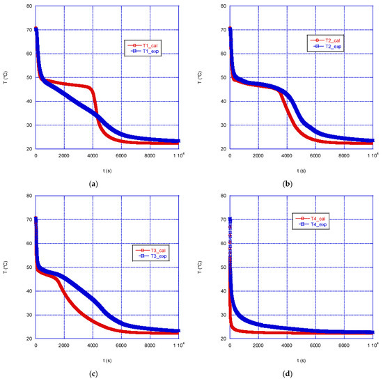 Comparison between simulated and measured temperature during the test with Twall = 22.5 °C and Ti = 71 °C at the thermocouple: (a) T1; (b) T2; (c) T3; (d) T4.