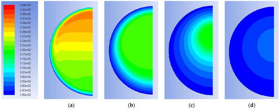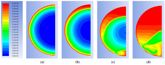 Colormaps of the temperature during the melting phase with Ti = 71 °C and Twall = 22.5 °C after: (a) 150 s; (b) 300 s; (c) 600; (d) 1200 s.