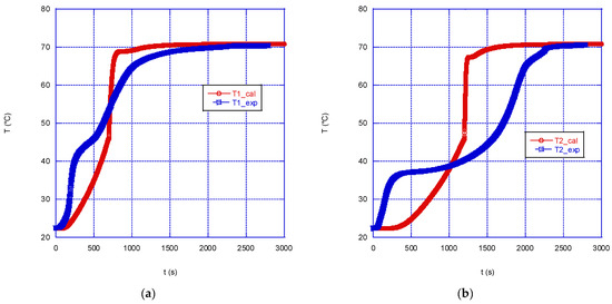 If we look at the temperature comparison reported in Figure 8, some significant differences can be noticed. The temperature at thermocouple T1 is predicted by the model rather well (Figure 8a), while in the correspondence of thermocouple T2, the model predicts a much slower heating of the solid mass, compared to the experimental trend, up to 40 °C, followed by a steep increase up to 71 °C, after approximately 1200s since the beginning; experimentally, however, the equilibrium temperature is reached after 2200 s (Figure 8b). Similar, or even larger, discrepancies are observed in the correspondence of T3 and T4, with the model predicting a much faster temperature rise, compared to the experimental one (Figure 8c,d), followed by some waving trend. Besides those significant differences, overall, the model predicts a faster melting of the PCM mass in the sphere: thermal equilibrium is predicted after approximately 1700 s, instead of 2500 s, as measured experimentally.