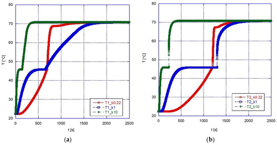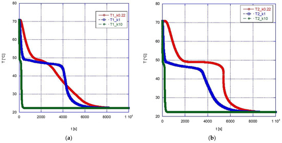 In the solidification phase (Figure 11), the advantage of using a high-thermal-conductivity material is apparent, with the final thermal equilibrium reached in a very short time (approximately 400 s) for k = 10 W/mK, i.e., less than approximately 1/20 the time required with pure PCM. However, in this case the advantage is apparent also for lower values of thermal conductivity (again, especially for the inner volume of the sphere), with the solidification temperature reached earlier than with pure PCM in any location inside the sphere, thanks to the higher conductivity of the external solid phase, and with a faster subcooling after solidification.